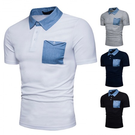 New Fashion Denim Stitching Men's Lapel Short Sleeve Polo