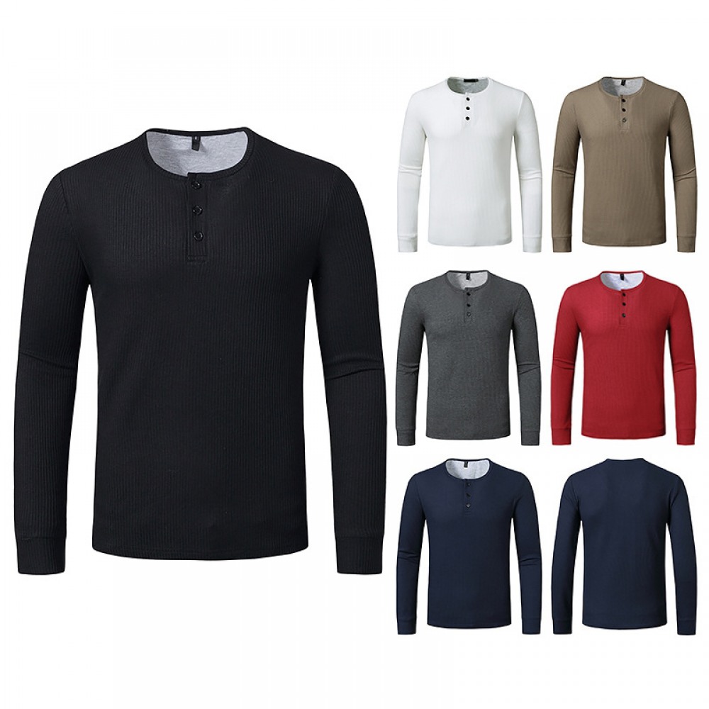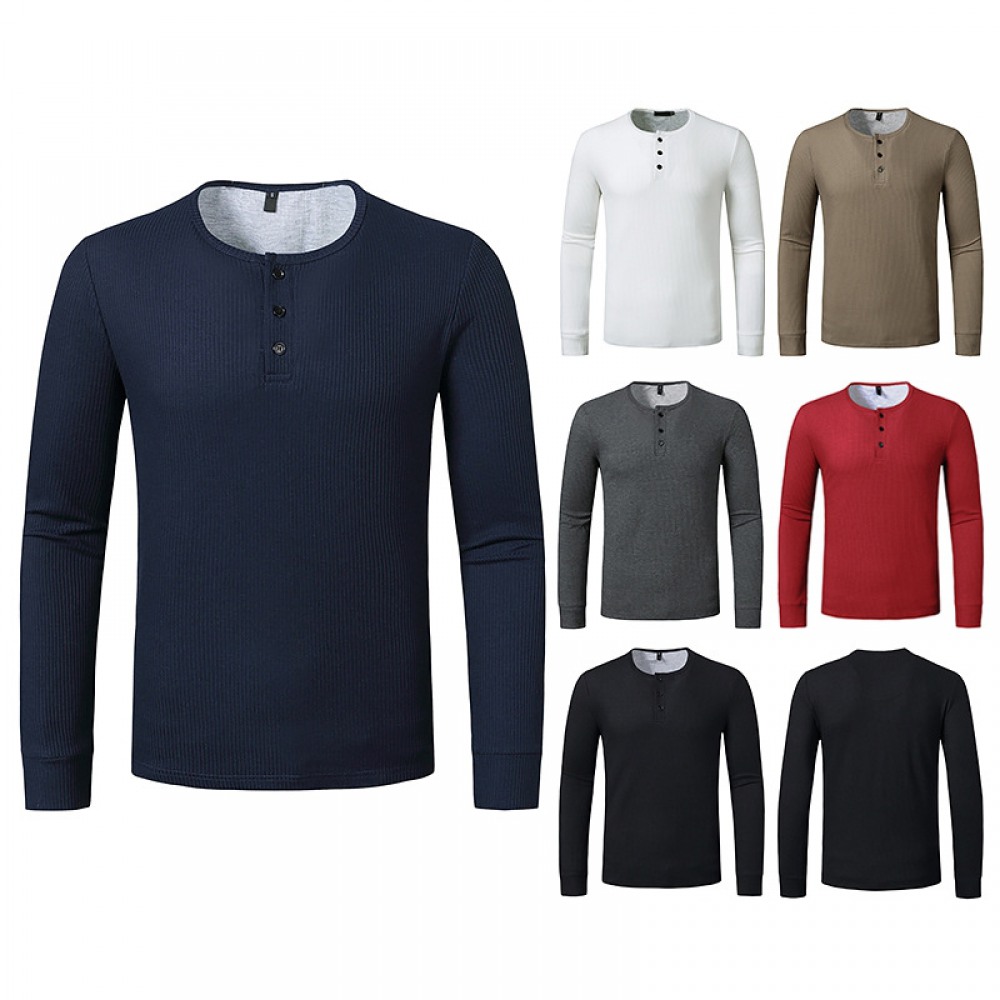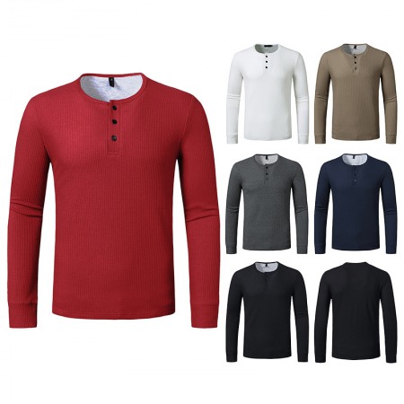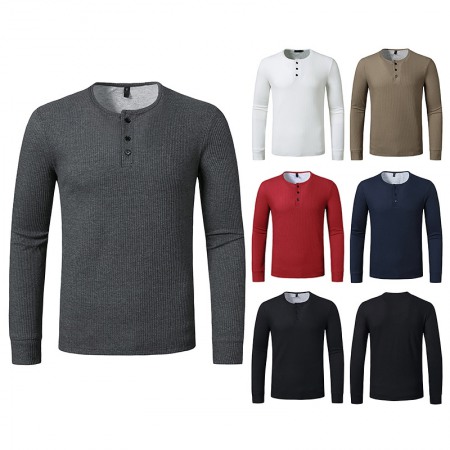 New Hollow Men's Autumn and Winter Long-Sleeved Bottoming Waffle Henry Collar T-Shirt